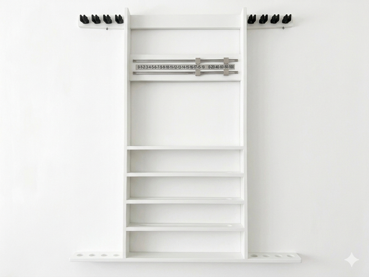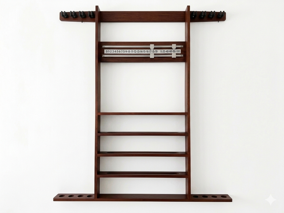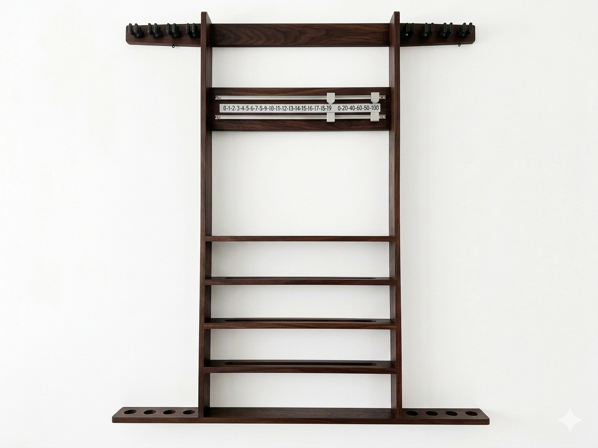 This wall-mounted unit is designed to keep your space tidy and sophisticated, featuring dedicated storage for up to 8 cues, an integrated scoreboard, ball-sets and a convenient hook for your triangles.