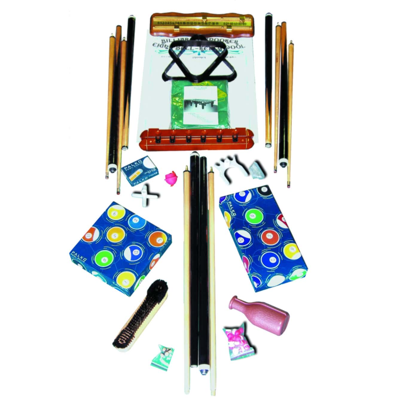 This premium Pool Table Accessory Kit includes cues, balls, a cleaner, a cue and ball rack, a bridge, and much more…