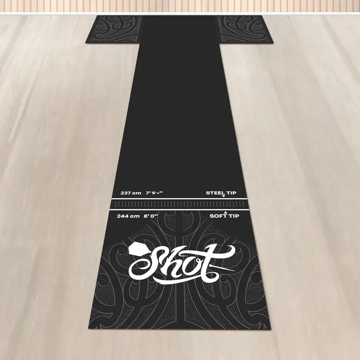 The Shot Professional T Dart Mat takes the toughness of a standard dart mat and adds an extra “T” defence zone beneath the dartboard on both sides. Offering greater floor coverage and twice the thickness at the oche, it delivers enhanced protection where it matters most, keeping both your floor and darts safe from damage.